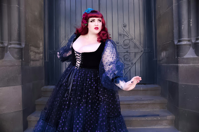 Oh my where do I start with this stunner? A fully corseted, stunningly sheer sleeved and layered full skirt this Starry Witch gown has it all!
